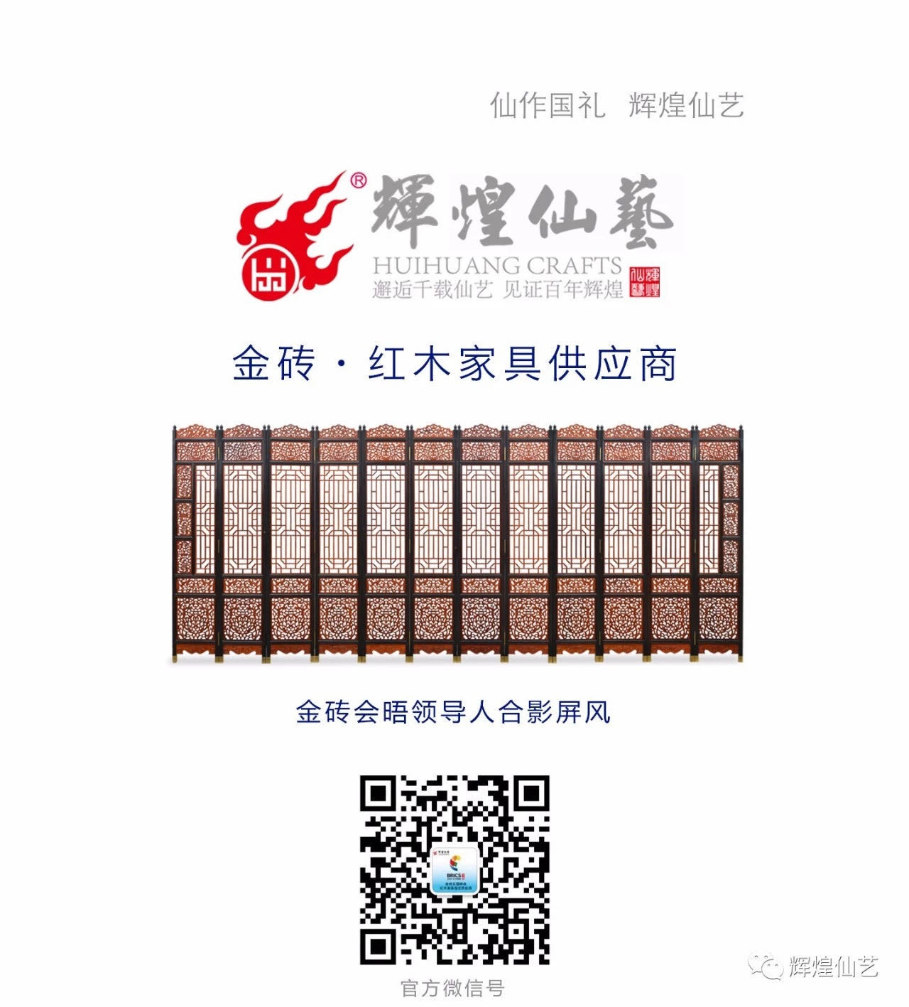 2017年,輝煌仙藝為“金磚五國峰會”提供國家領(lǐng)導(dǎo)人合影屏風(fēng)家具作品。